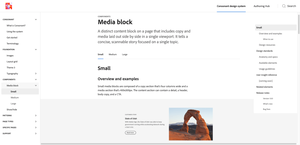 Documentation for the Media Block component, showcasing the repeatable content architecture I established across Consonant’s component library.